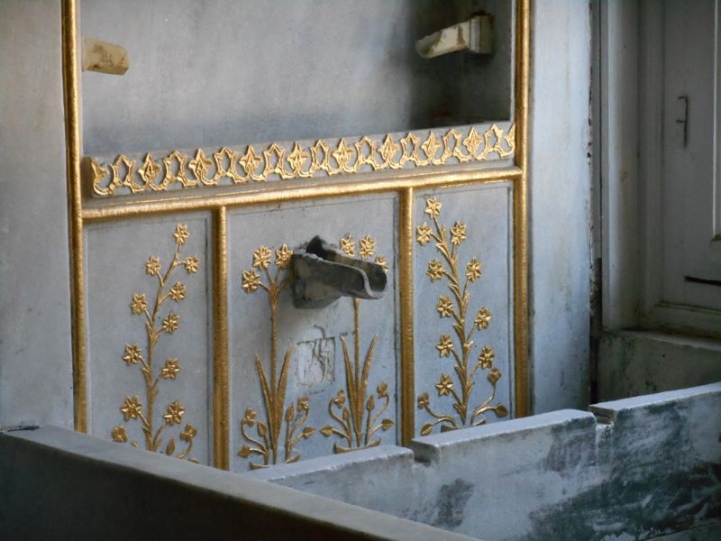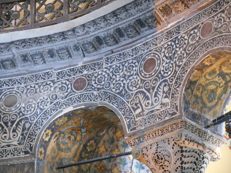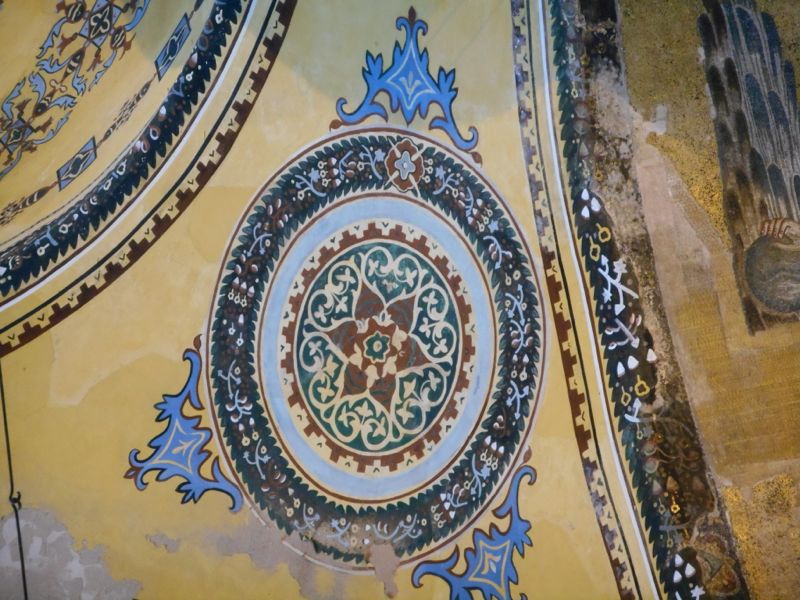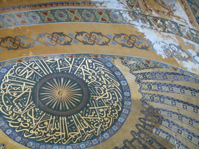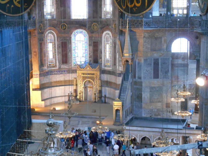 When Hagia Sophia was converted to a mosque, several changes were made. Minarets were added and religious figures were plastered over. (These have since been at least partially restored.) The one pictured below has a real gold mosaic background. A small construction was also added to indicate the direction to Mecca. There is currently scaffolding covering a large portion of the main area.