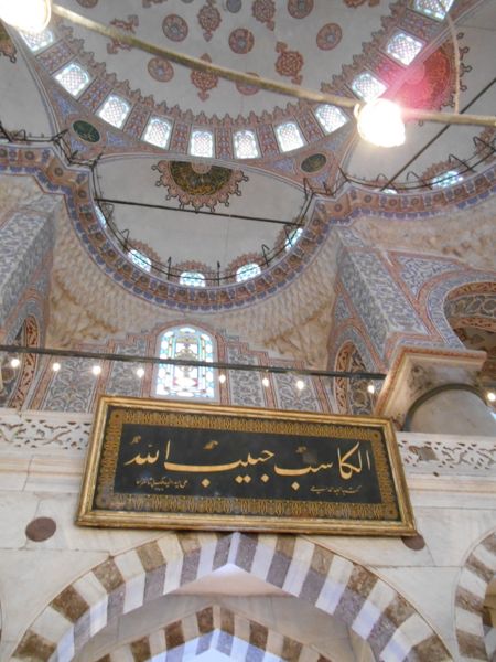 Our first stop was the Blue Mosque[*]. (It's really called the Sultan Ahmet Mosque, but all tourists call it the Blue Mosque.) After showing us the main points of the mosque, Mert took us into a quieter area and explained some of the principles of Islam to us and answered our questions. (While we were sitting there, a tourist walked by and took our picture, probably thinking we were students!) I came back again later that evening so I could look around some more when there weren't so many people.