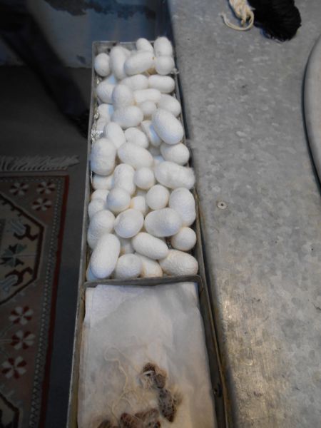 After lunch, we visited a carpet-making co-op. I was especially interested in the silk carpets. I had never seen silkworms before and I was curious how they got the silk from the cocoon. They showed us the process and explained how the fine strands of silk were spun together. Then we actually got to try a hand at making a carpet. (No, that's not me, that's one of their carpet makers.) I'm sure that as soon as we left the room, they took out the knots I put in!