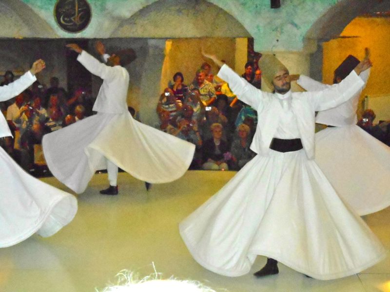 The day's activities concluded with a visit to a Dervish[*] ceremony (another optional activity). This was a re-creation of a religious ceremony[*], but shortened for tourists. Since it was a religious ceremony, no photography was allowed. However, after it was over, they came back out and did a few twirls for the cameras.