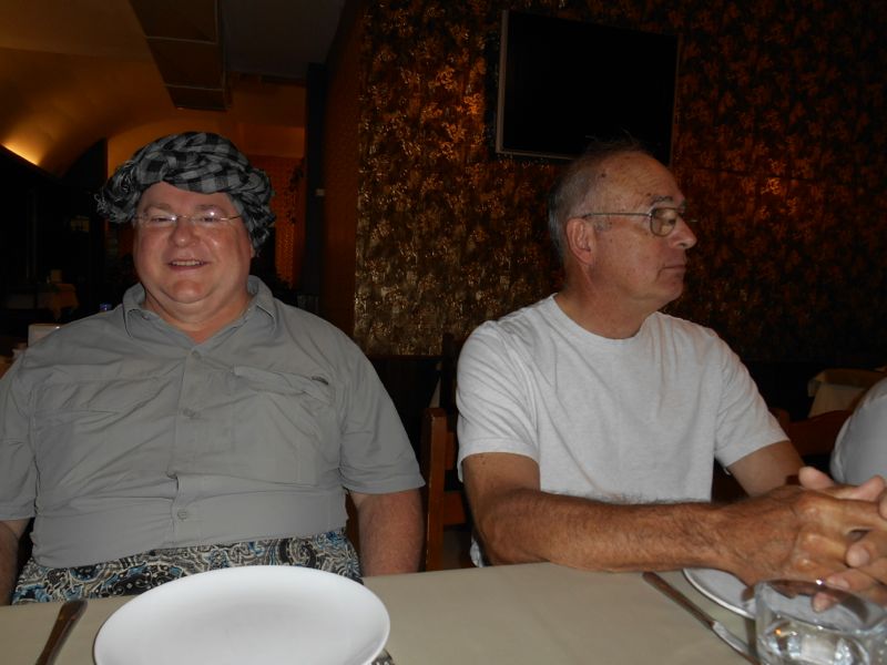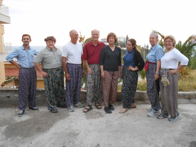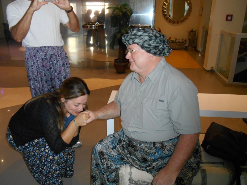 And finally, it was time for our goodbye dinner. Several of us had bought baggy trousers, either at the farmer's market in Korkuteli or later in Pamukkale. We decided to wear them for our goodbye dinner. Throughout the trip, Tom had often referred to himself as "the feudal lord" so Mine decided to dress him up appropriately (and of course, display the proper respect).