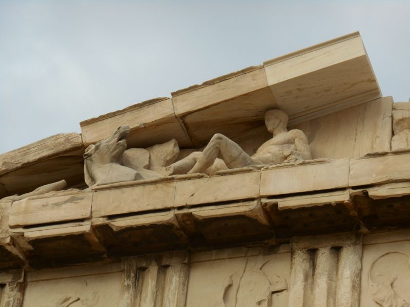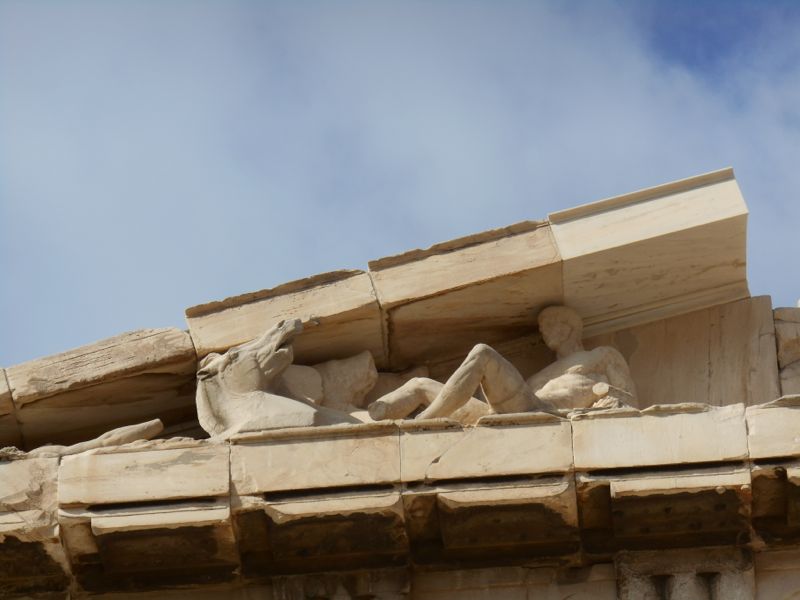 The end of the Parthenon was decorated with a scene describing the contest between Athena and Poseidon for the devotion of the city. There is a small model of this in the Acropolis Museum, as well as a recreation of some parts of it. This one small portion is displayed in the original position.