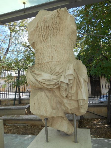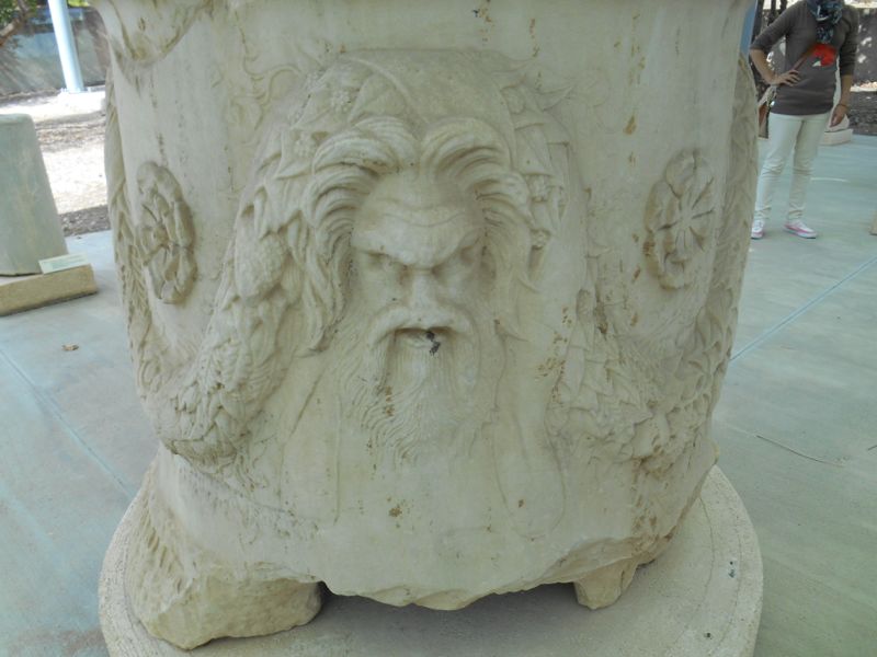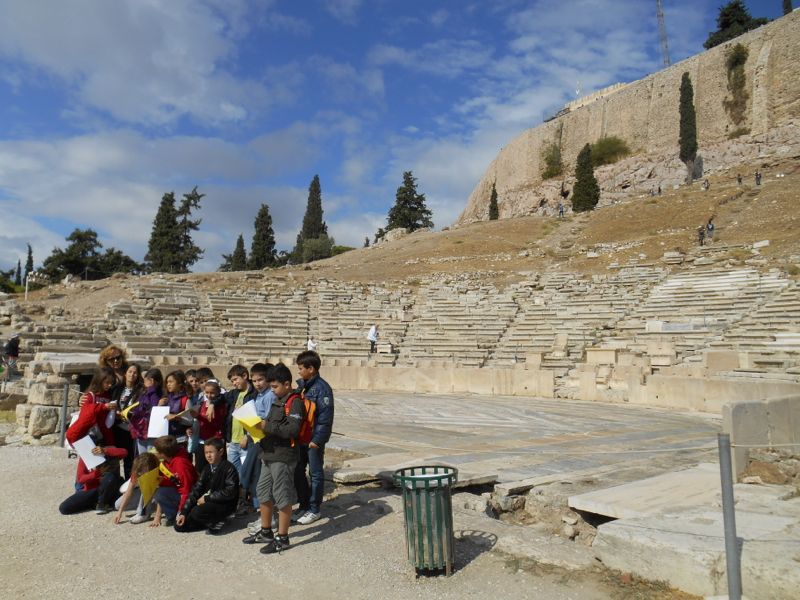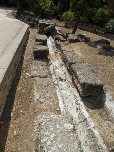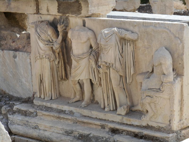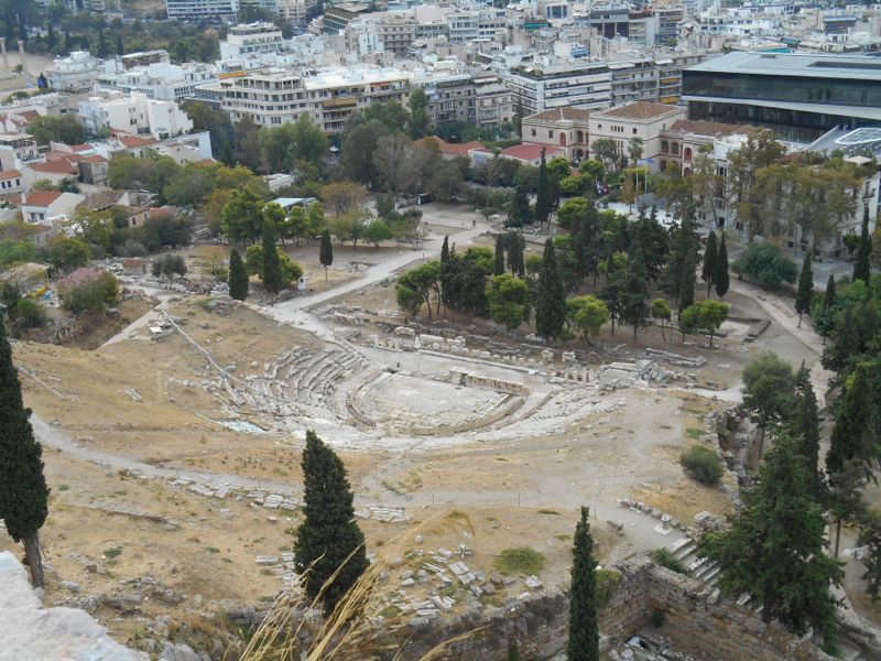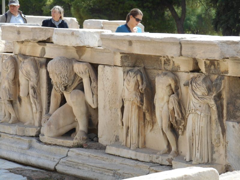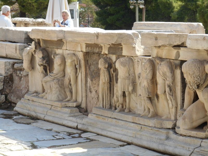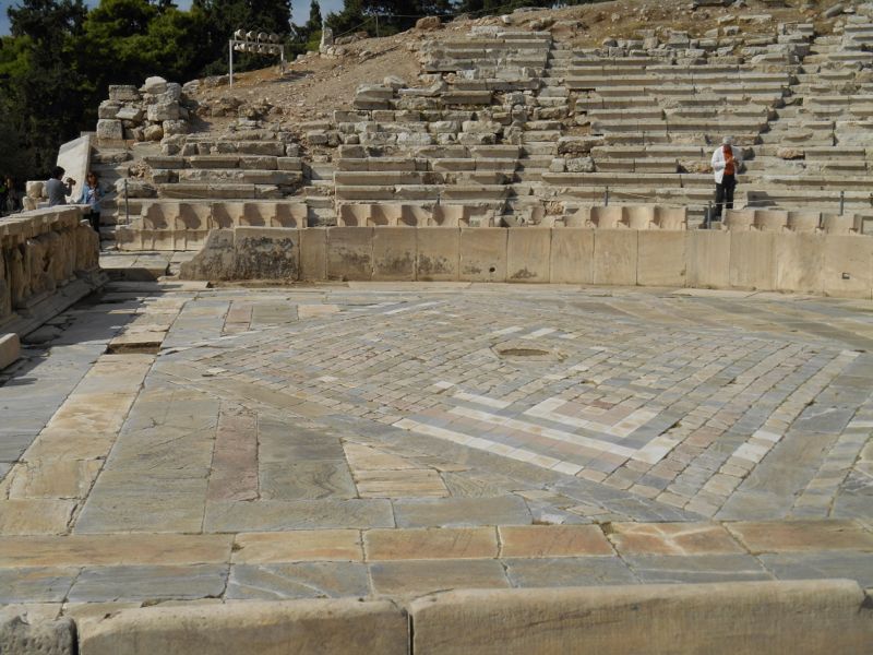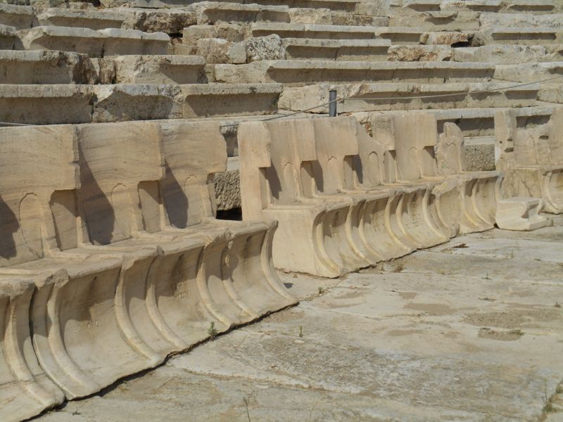 Of special interest in the Theater of Dionysis[*] are the carved seats for dignitaries, the mosaic floor, and the reliefs. Just walking through, I could imagine that an ancient Greek play was about to be performed. A group of schoolchildren were on a field trip exploring their heritage when I visited.|            |   |
