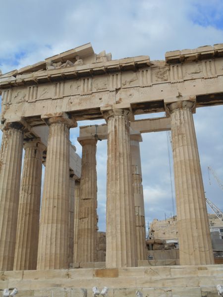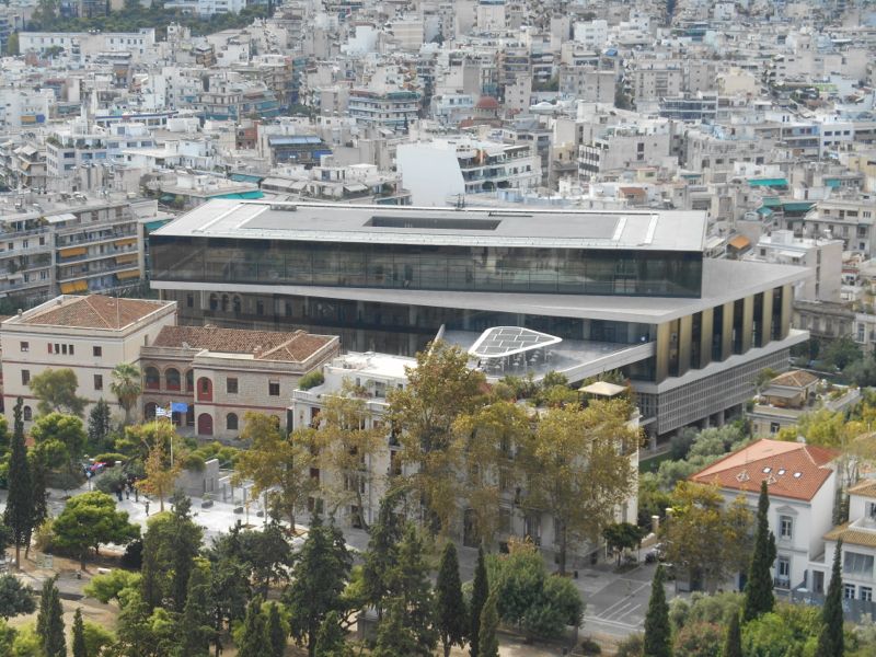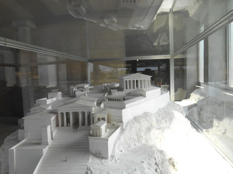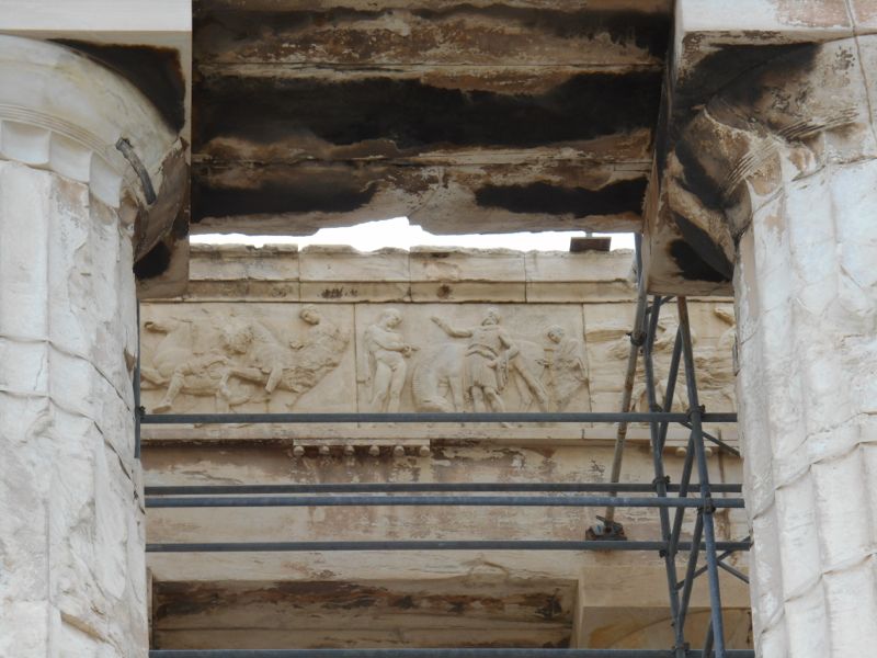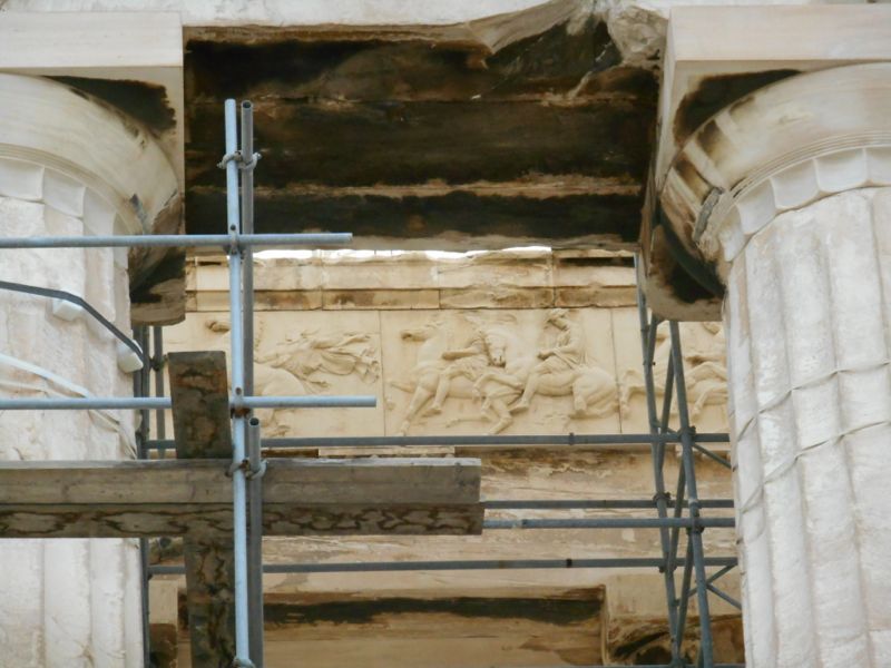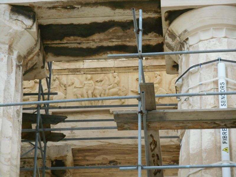 The top floor of the Acropolis Museum[*] has a full-sized recreation of the frieze around the Parthenon. There are a few originals, but most are in British Museum, where they are known as the "Elgin Marbles". (No photography was allowed inside.) The museum is built over the remains of an ancient village, currently being excavated.
