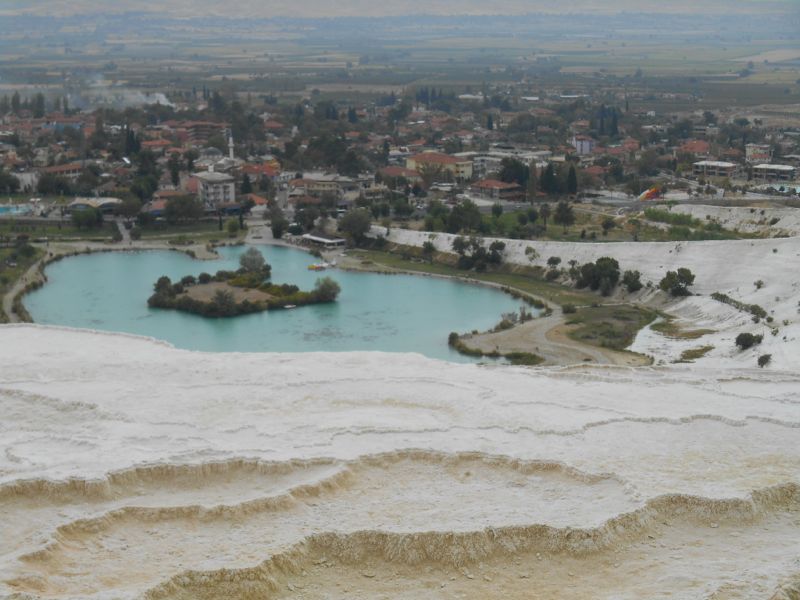 The springs are on a hillside overlooking the present day town of Pamukkale. On the plateau above the springs is the ancient town of Heirapolis. It developed as a tourist resort in Roman times.