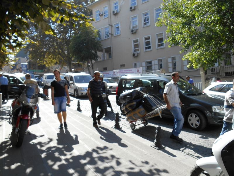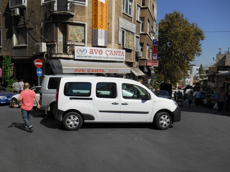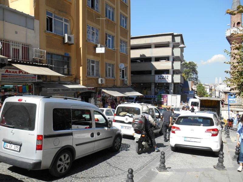 The Grand Bazaar wasn't the only place that was crowded. As part of my wandering, I found some shopping streets in the non-tourist area. The traffic there was incredible! Cars often double parked, so there was hardly room for anyone to drive through, even with a small car. I think the guys walking were actually going faster that than the cars. (In the picture on the right, cars are not just double parked, but triple parked in the intersection!)